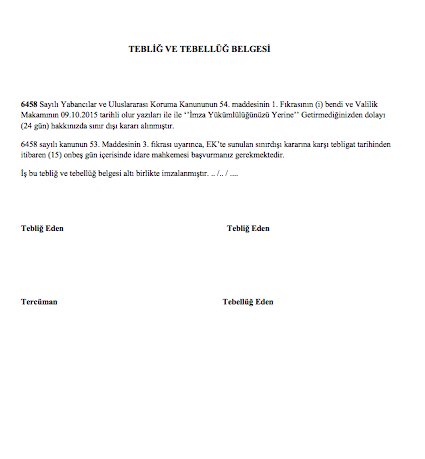 YUKK Madde 54/1 Kapsamında Verilen Sınır Dışı Tebliğ Tebellüğ Belgesi Örneği