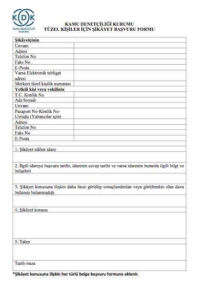 Kamu Denetçiliği Kurumu Tüzel Kişiler İçin Şikayet Başvuru Formu