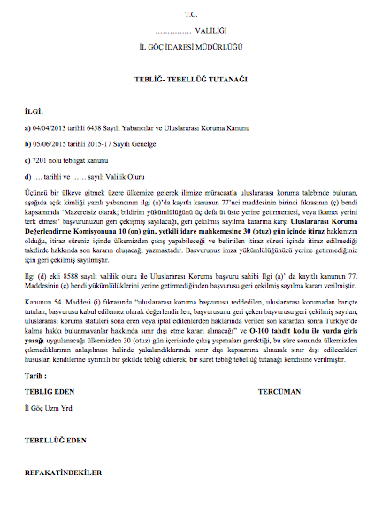 Uluslararası Koruma Başvurusunun Geri Çekilmiş Sayılması Kararı Tebliğ Tebellüğ Tutanağı